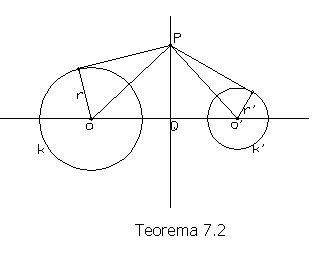 Teorema 7.2: Skup p svih tačaka zadate ravni kojima su potencije u odnosu na dva kruga k(O, r) i k'(O', r'), O≠O', međusobno jednake, je prava upravna na pravoj OO'.
