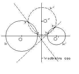 3. Krugovi su disjunktni-dovoljno je odrediti jednu tačku radikalne ose. Da bi se ona odredila zadati krugovi se preseku trećim krugom i presečne tačke jednog od tih krugova sa trećim krugom obeležimo sa X i Y, a drugog sa X' i Y'. Presek pravih XY i X'Y' je tačka koja pripada radikalnoj osi.