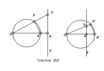 Teorema 10.2: Ako sadrži središte inverzije, prava se inverzijom preslikava na sebe, a ako ne sadrži središte inverzije, preslikava se na krug kome nedostaje središte inverzije.